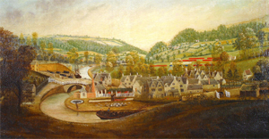View of Wallbridge Stroud mid to late 1780s, artist not known. Showing blankets drying on racks (red, white, blue) outside mill. (Courtesy of the Museum in the Park, Stroud District Museum Service, Stratford Park, Stroud, Glos. GL5 4AF.)