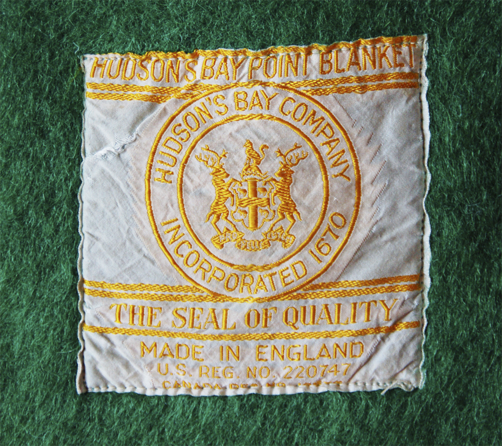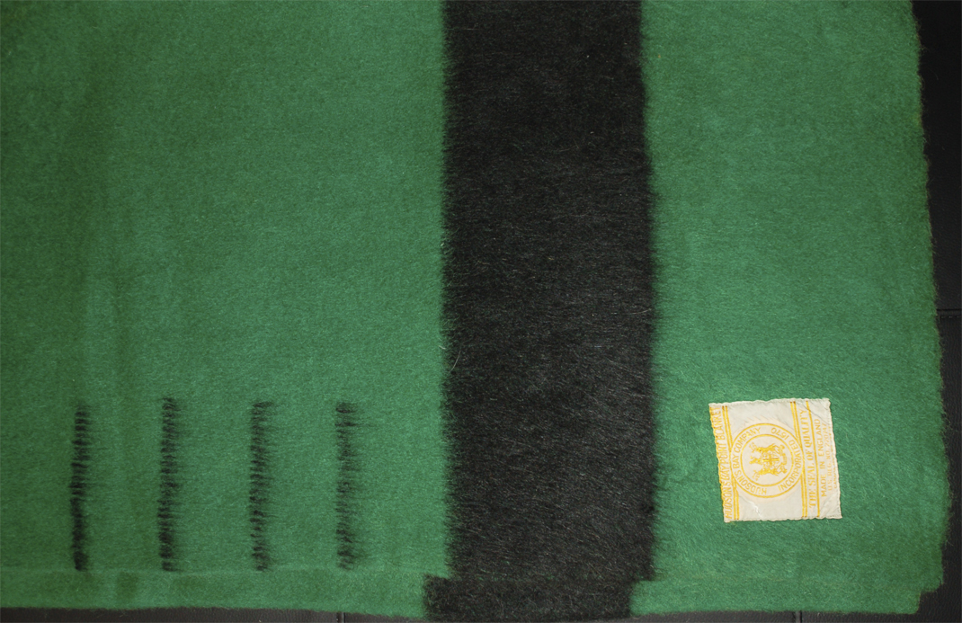 72 x 90in.,(full standard size) Rich even green. One 1/2 inch faint yellow nap spot (on front next to top heading) very slight yellowing of nap at end edge. Small tear in label. Size exc, nap good, weave good, colour good, label good =83/100